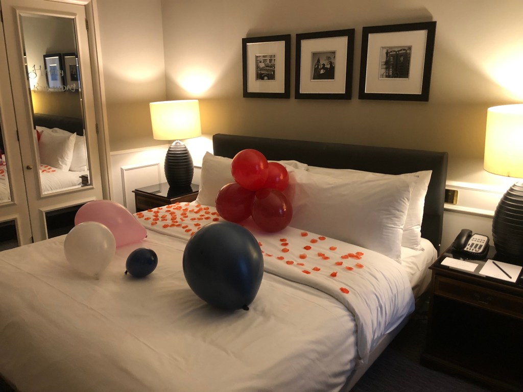 We had been upgraded to a suite as there wasn’t a twin room available. I told Jo she could have the bedroom; I’d sleep in the sitting room and she was somewhat flummoxed when greeted by rose petals and balloons on her bed and ‘Happy Birthday’ written on the mirror.